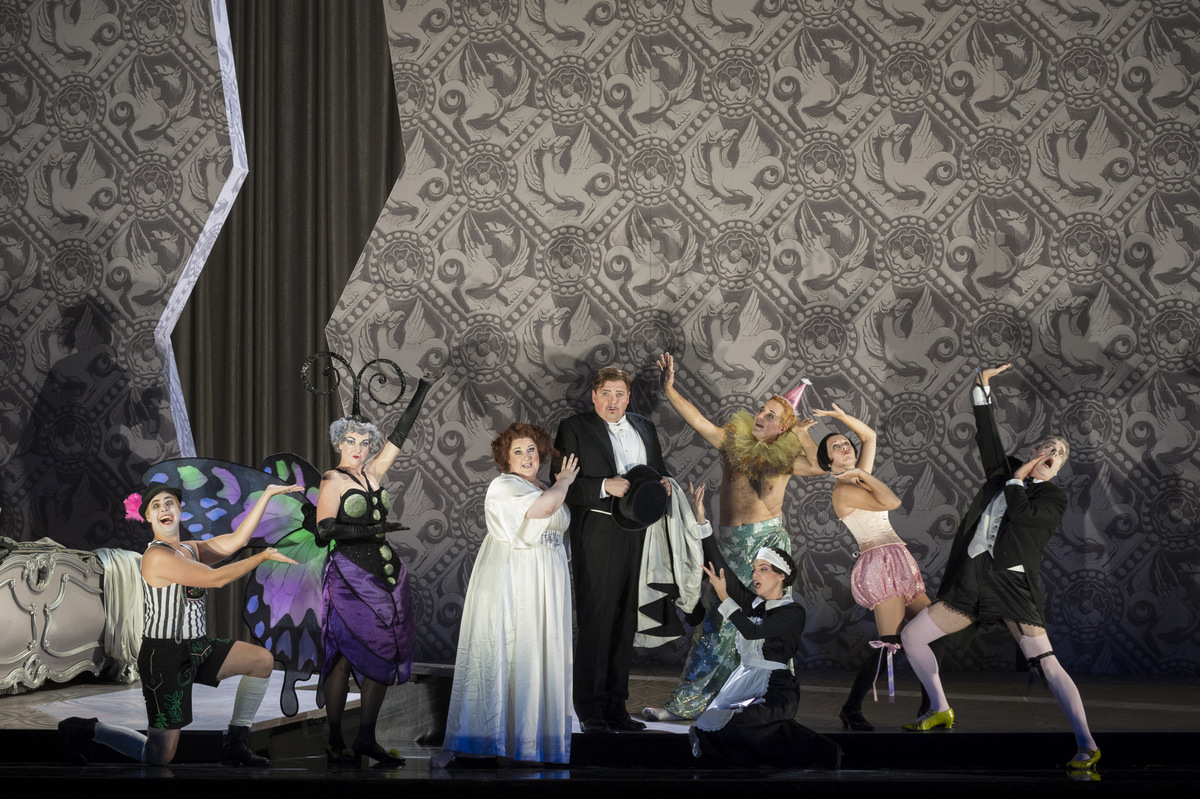 Tamara Wilson as Rosalinde, Michael Schade as Eisenstein and Ambur Braid (kneeling) as Adele (Photo: Chris Hutcheson)