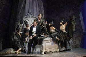 Michael Schade (Eisenstein) and Laura Tucker (Prince Orlofsky) plus bat girls. (Photo: Michael Cooper)