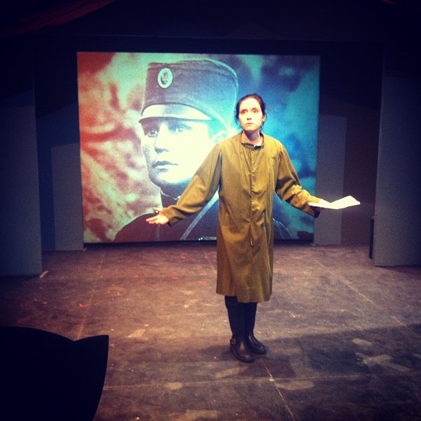 On top of this we have an online component / the play is live/streamed on YouTube and we are expecting the audience / in the house as well as around the world to tweet their own WWI stories to us / this happens in a segment of the play which is formatted to look like an audition for future theatre-film projects about WWI. It is interesting that this dynamic is far more present in some European countries / there are whole festivals showcasing new works about WWI. Canada seems to be less obsessed with the subject.