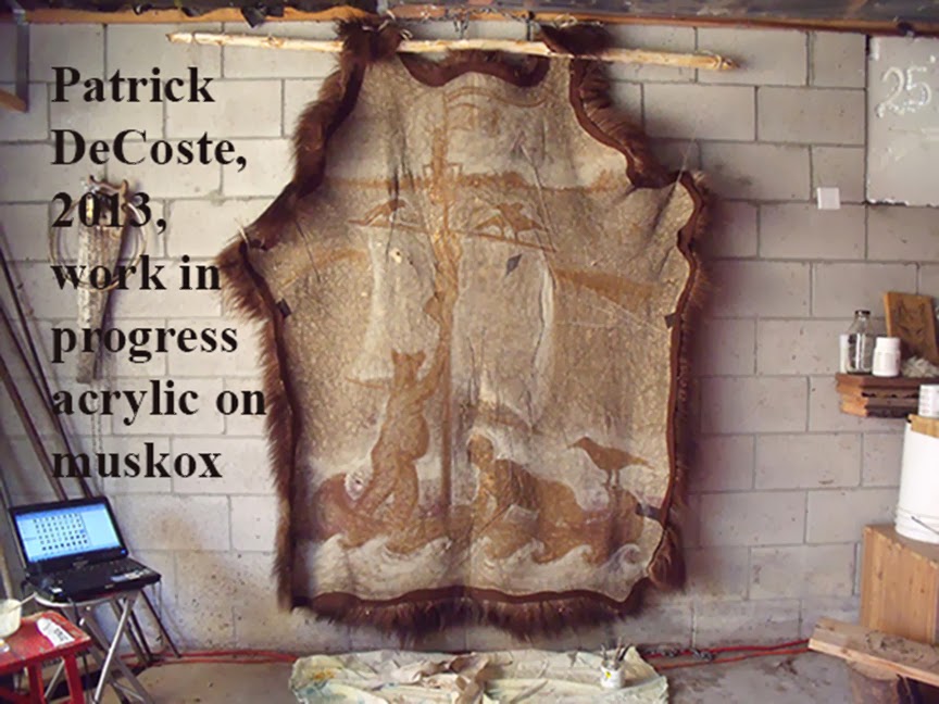 Patrick DeCoste: “The Dream on Muskox” (2013) work in progress, acrylic on muskox skin, 66 x 72 inches. Yes, it’s six feet tall.