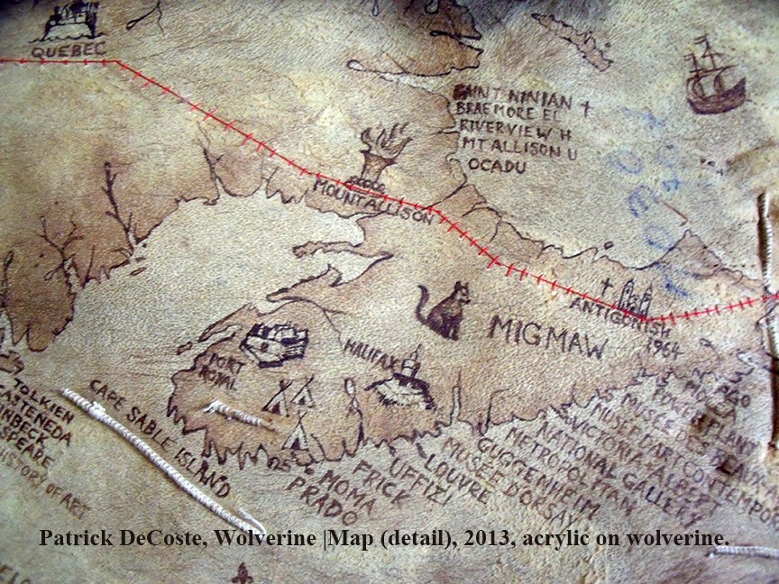 Patrick DeCoste “Wolverine Map” (2013) mixed media on wolverine skin, 3ft x 4ft.