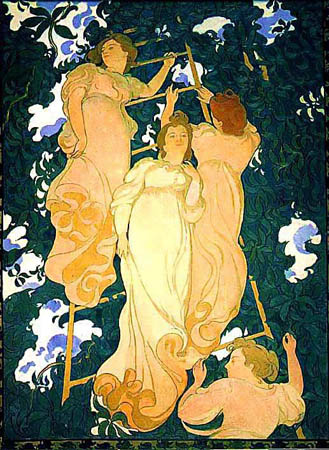 Yet it’s worth remembering another symbolist example. Maurice Denis & Paul Gaugin –two of les Nabis—were very close with Maeterlinck and his circle. Denis (who also created the cover for the first edition of La demoiselle elue) did the program for Pelléas’ premiere (the play in 1893 that is), including a fascinating image of a woman who is likely his beloved; they married later in 1893. Every woman he painted for a year or two had this same face, because she was his ideal.