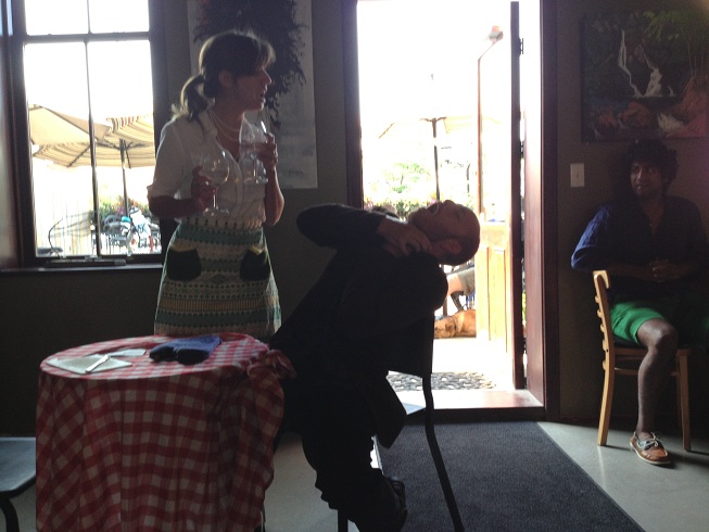 Note: we’re deep in Revel Caffé. My friend and I sit at the communal table, right beside two very young children brought by well-meaning relatives. How young? They’re younger than the age at which I took my daughter to see Magic Flute in English, as her first opera, and hello, these aren’t meant for children (as they found out in short order: vacating their seats…or maybe their auntie finished her latté?). At one point a wacky cat carrier went by, and the whole time –just outside the door that was used for several entrances by the singers—a well-behaved German Shepherd [NOTE: i am fixing this later, having realized i made a mistake in my haste…he’s not a shepherd. SORRY] cocked his head appreciatively throughout (and he shows up in some of the photos….plus THIS PORTRAIT that his owner graciously permitted).