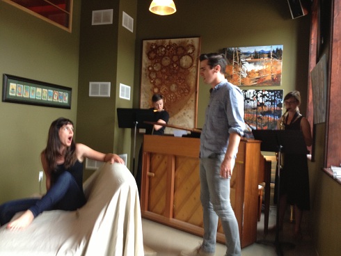 We began with the romance of (What rhymes with) Azimuth, music composed by Ivan Barbotin with libretto by Liza Balkan (who is BOP’s stage director). A man and woman (played by Stephanie Tritchew, mezzo-soprano, and Geoffrey Sirett, baritone) who explore two very different discursive pathways, find meaning and a connection.