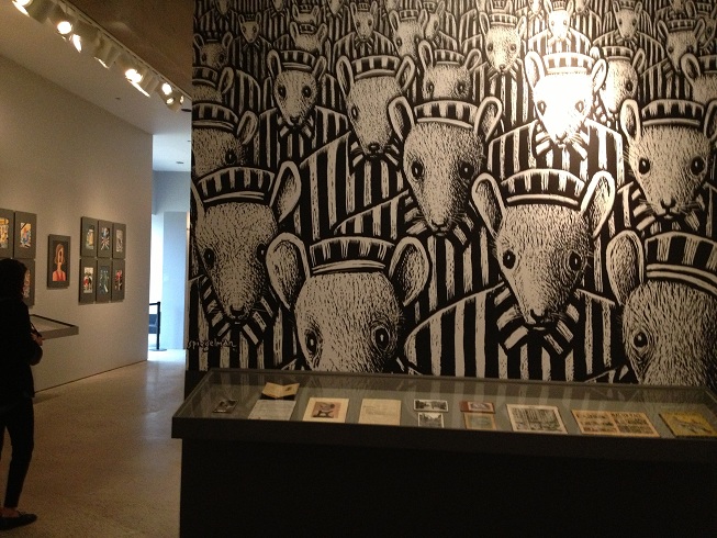 It’s ridiculous if not perverse to walk into the gallery and see Maus in its entirety on a wall. We usually encounter it in book form, not spread out on a wall: as though it were a single work of art. But that’s actually what it is. One can’t see much of it unless one were very tall AND able to bend low to take it all in. My eyes feel weak before all the details in these fabulous creations. I ‘m remembering my recent walk through the Michaelangelo show that’s still here at AGO, another tribute to the power in tiny works of art. Small isn’t just beautiful, it can be awesome & overpowering. I had to step away partway through, a bit overwhelmed by what I’d seen.
