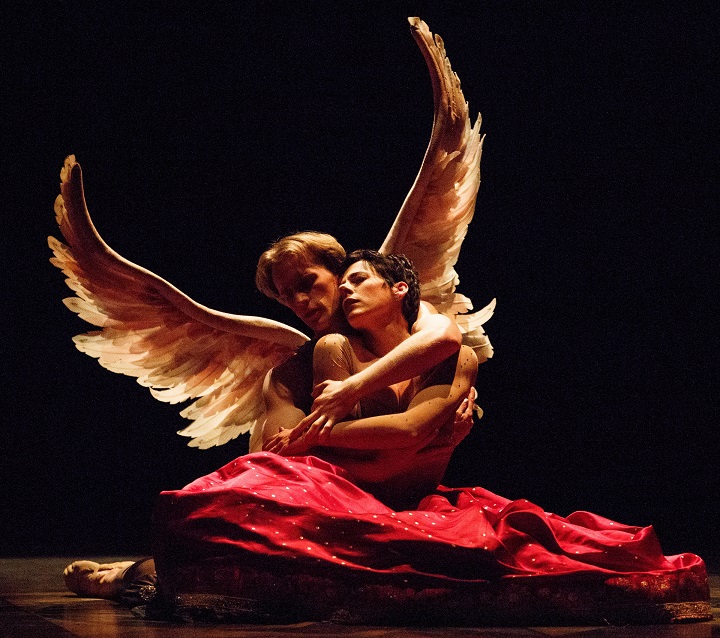 Armide (Peggy Kriha Dye) is tormented by her contrary impulses, unable to kill Renaud (Colin Ainsworth). photo: Bruce Zinger.