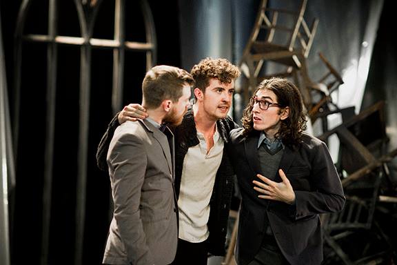 When the players arrive? Then it’s no longer just on Mousseau’s shoulders. Whenever there is a musical set-piece –and full marks to Jeremy Hutton, Kristen Zaza and anyone onstage during these magical moments—the piece comes fully alive. In the oath-swearing, in the funeral for Ophelia, in the fight sequence, Santalucia does well with his management of people onstage.