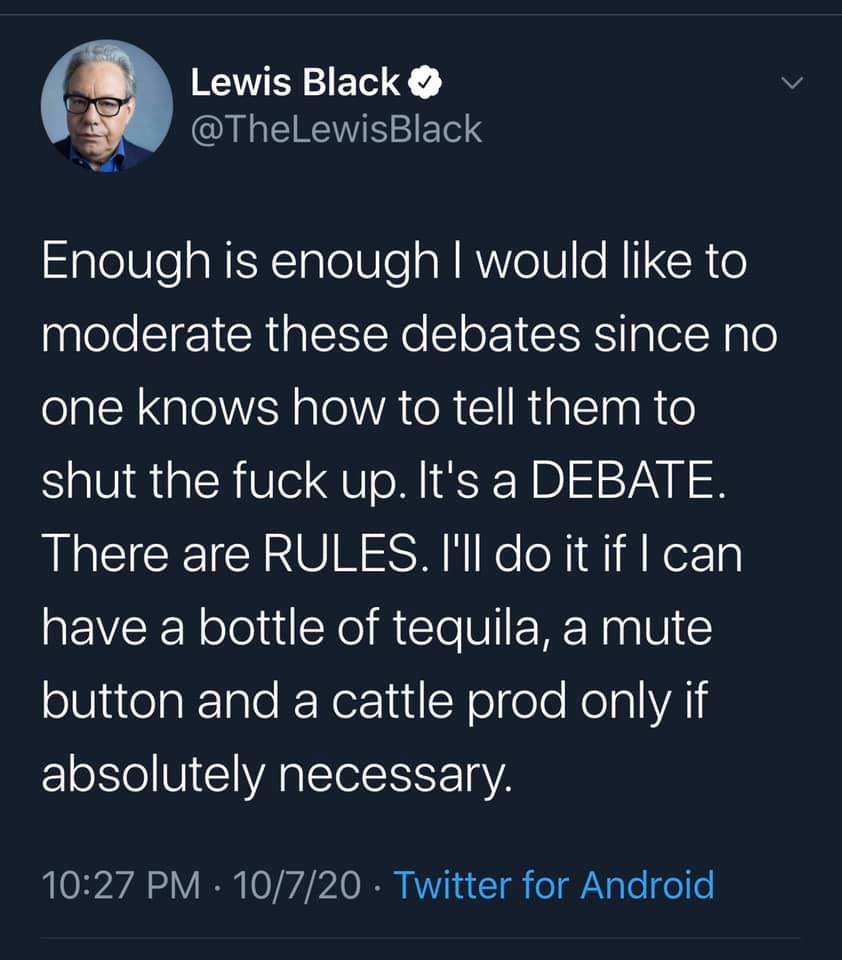 I regret the violence implicit in all of this. Wouldn’t it be amazing if debaters were required to listen to one another, and before replying, were required to spend 30 seconds paraphrasing the words of their opponent, to prove that they understand what’s being discussed? I can imagine a debate protocol where you are required to defend the point of view of your opponent. Joe Biden espousing the GOP ideals, Donald Trump defending Obamacare. Is that a mind-expanding exercise to dream of a debate as a kind of drama of identification?