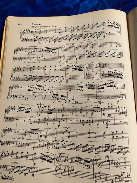 That page of music is the site for an encounter between the player & the composition, as though it were a football player meeting the football. Does that sound crude? It’s easy to make noise, harder to make something beautiful. But we can imagine a vast continuum of ability between those (at any age) who are just beginning to play, and those who have acquired expertise, mastery, even virtuosity. The music may require care from the player, perhaps playing it slowly, perhaps only undertaking a few notes from one hand or the other rather than taking on the whole piece. If one has heard the piece before, if one is a good sight-reader, one might dare to play the whole thing up to speed. Sometimes we have no choice, as that’s what’s required in a church or music-theatre or opera when someone puts a score in front of you and you have to make it happen with little or no opportunity to practice.