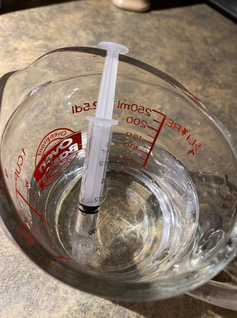 So far it has worked every time, although on occasion we had to refill the syringe and spray again. Each time it’s a few cc’s of water, done just as the pill is going down.
