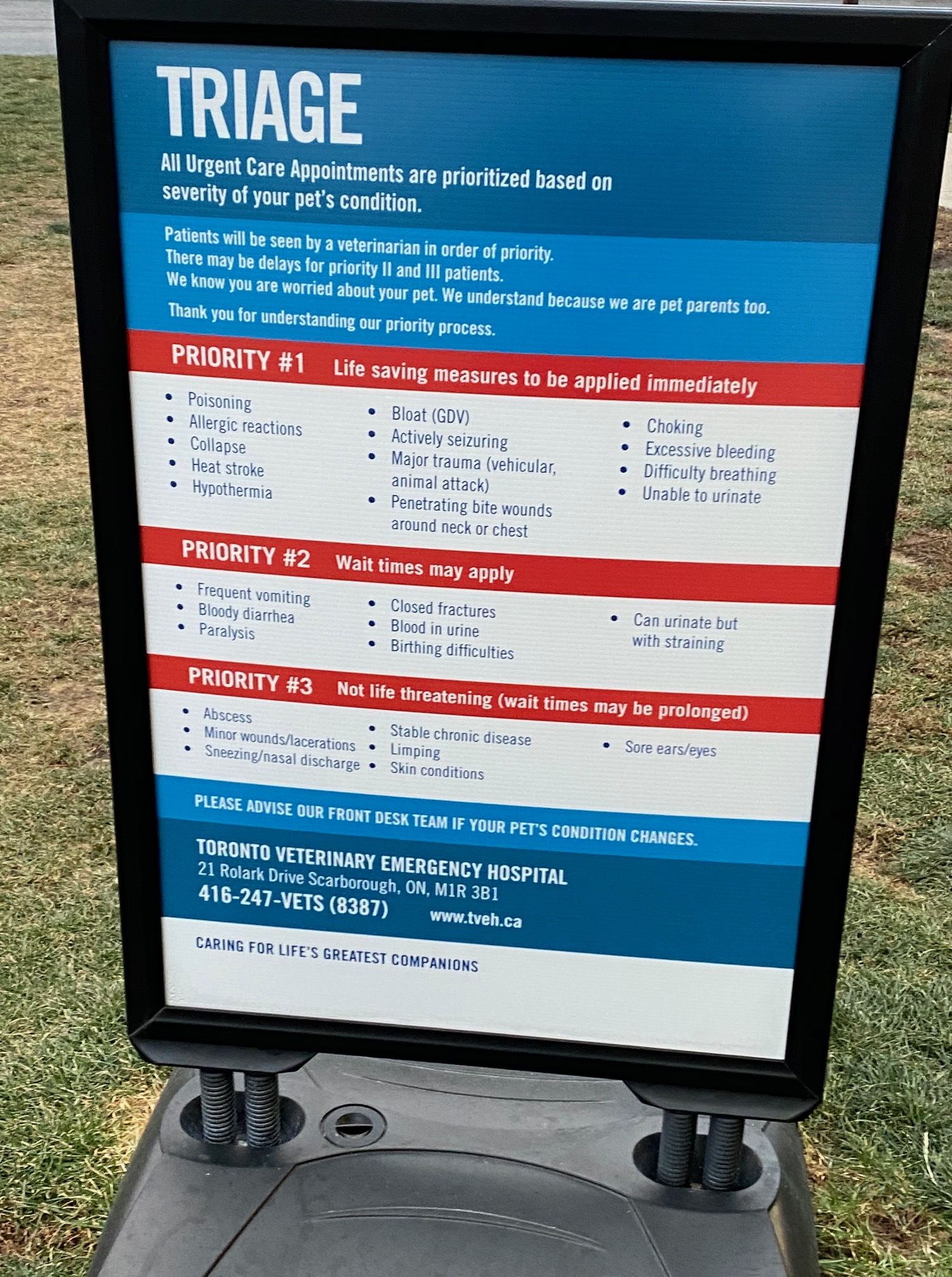 We took her to the emergency veterinarian hospital. While we were freaking out at her condition, concerned that at her advanced age, she might be close to death, we were confronted with the signage at the hospital that states their priorities.