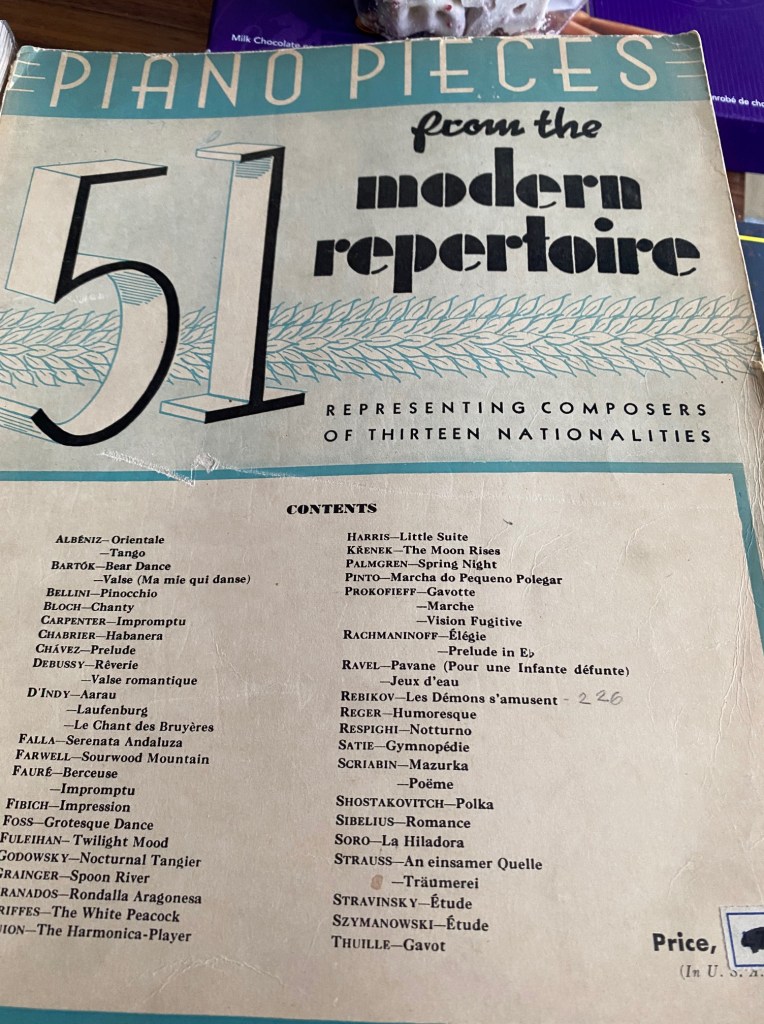 8 Prelude in E flat op23 #6 by Sergei Rachmaninoff… Rachmaninoff is “Sergei” when Prokofieff is “Serge” and that they say “Prokofieff” not “Prokofiev”. The title page of the book says “1940”, when there likely would be more inconsistency in the transliteration than what you’d see in 2020. But aha the accuracy comes at a price, right? much more than $3.00….In this lovely collection there are supposedly thirteen nationalities represented in 51 compositions. But I suspect it’s all the same to Sam.