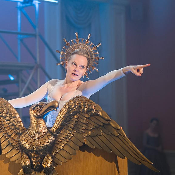 We’re mostly seeing a spectacle performed on set installations inside a beautiful ballroom with a chandelier, to gently suggest places such as the sepulchre of Jesus, a shining platform apt for the Archangel or another darker one for Lucifer: just as you might get in a medieval mystery play. While there’s a big empty space in the middle for singers and especially for dancers, those platform installations impact the dramaturgy of the film, as both director Marshall Pynkoski and choreographer Jeannette Lajeunesse Zingg sometimes subdivide the stage, seeming to create localized events. The sepulchre is first shown occupied, later with flowers, but it is a subset of the larger stage as though it were an actual locale, and not just a place to play the scene.