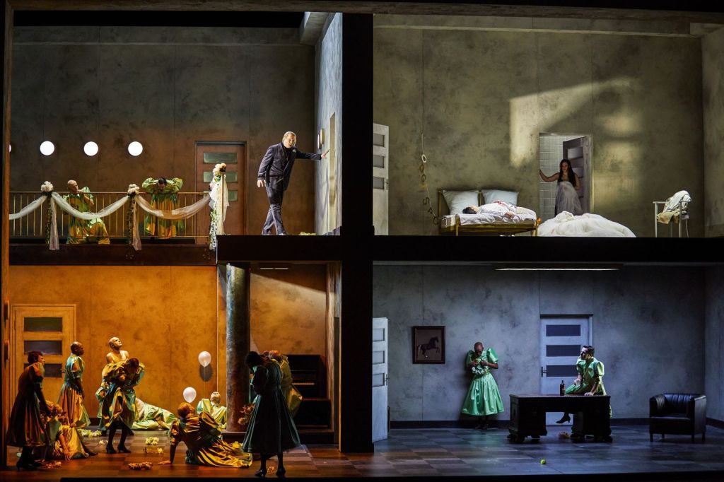 This production is often illuminating. The set exposes multiple spaces where, for example, we see Lucia actually killing Arturo, “offstage” from the others who are singing at that moment.