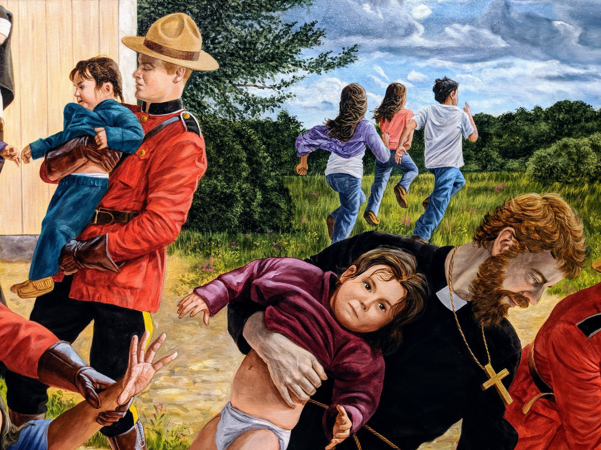 No it’s not as extreme as the images in our minds from Canada, best imagined in the paintings of Kent Monkman, of children dragged forcibly from their parents by priests & Mounties.