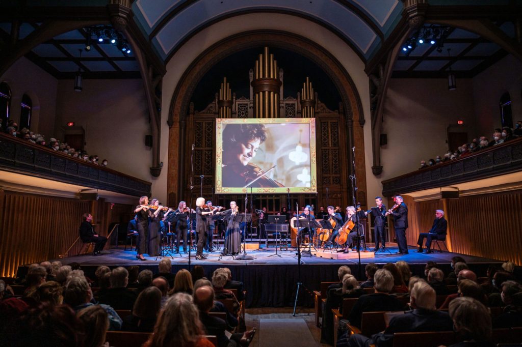 R.H. Thomson narrated a kind of documentary of the life and times of Jeanne Lamon’s spirit: as embodied in Tafelmusik and their baroque music. Lamon’s life story is almost indistinguishable from the life story of the orchestra, given her role in its founding and ongoing life, their decades long relationship.