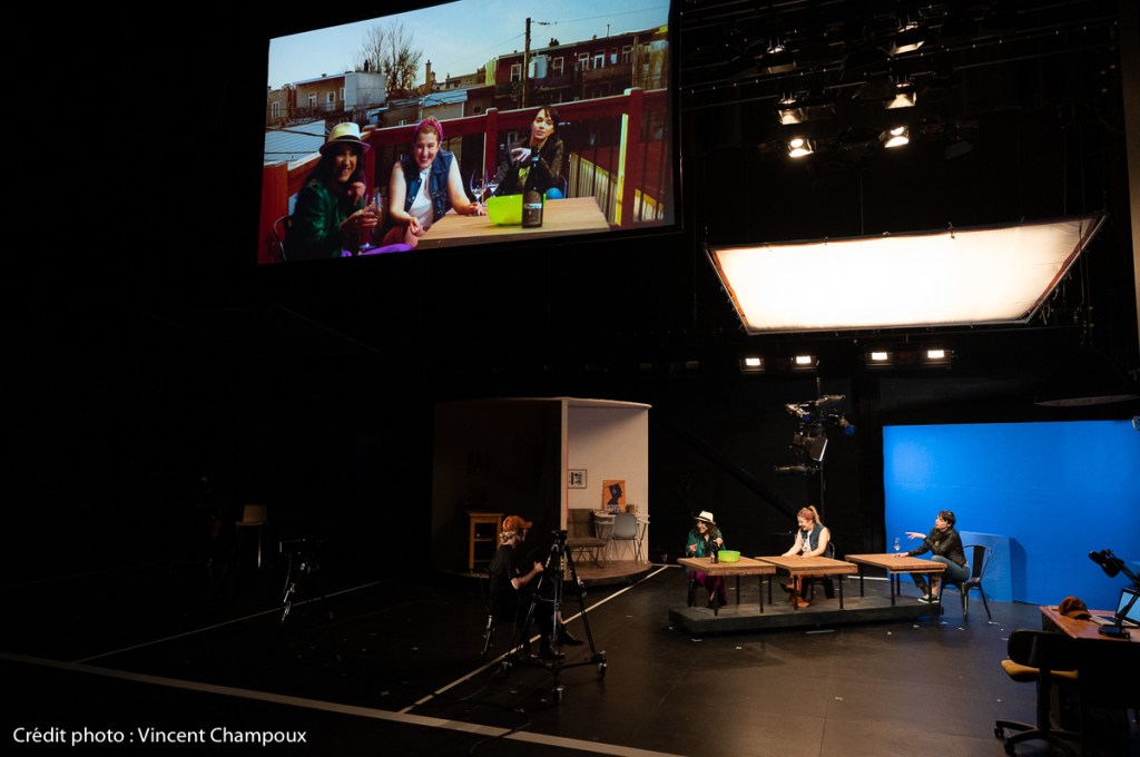 Five women fill the stage of Crow’s Guloien Theatre with vibrant life, sometimes throbbing with joy, sometimes distressed and inconsolable. Some of what we see and hear is like documentary film, as though we’re watching Québec reality TV, courtesy of Théâtre Français de Toronto. They’re mostly speaking French but we have subtitles and lots of video.