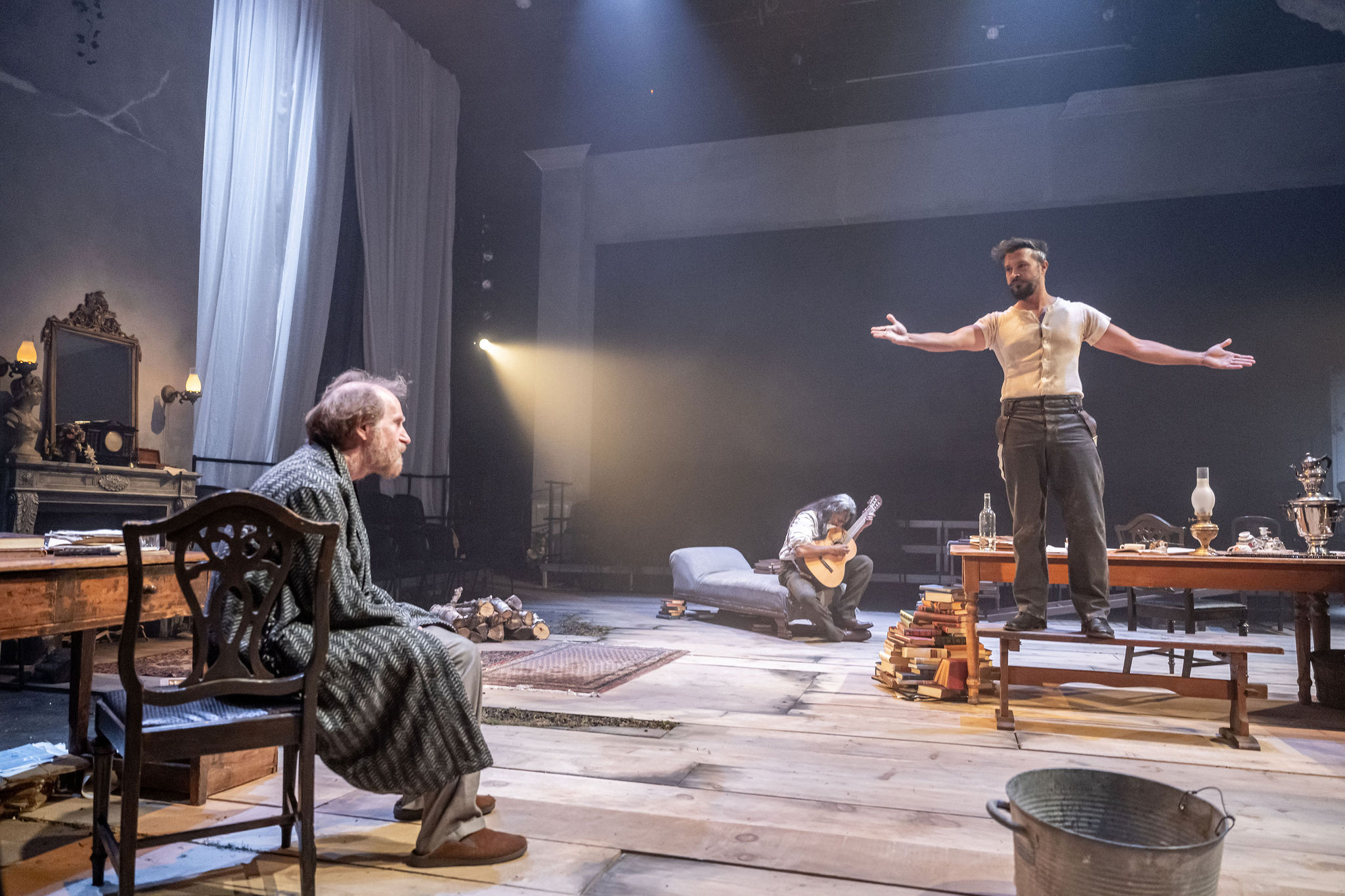 Repo-Martell & Abraham encourage a feminist reading of Chekhov’s text: or at least they refused to allow the sexist / misogynistic language of several characters to disbalance the show’s interpretation. Maybe my age is showing but I recall productions where the contrasting pair of Yelena (beautiful & living a life of bored luxury) and Sonya (plain & hard-working) underline some sort of imagined political or moral symbolism by the playwright. Yes we do hear judgments hurled at Yelena by other characters. But perhaps the text has been waiting for interpreters who would see past the surface, showing the challenges faced by each of these young women. The magical scene between Yelena (Shannon Taylor) and Sonya (Bahia Watson) is one of the highlights of the show.