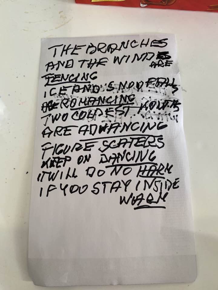 As you may already have noticed, I missed a lot of live performances, extra careful about infection as I continued to take meals to my mother 2-3 times per week. She’s still going strong at 101. While cataracts make it very hard for her to see, forcing her to write in block capitals using a sharpie, and while her hearing isn’t great either, she’s completely lucid. The following rhyme was written at around 2 am in December on a cold night.
