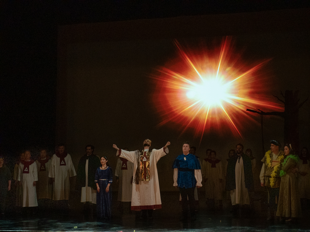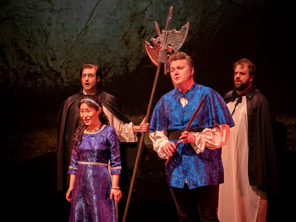Stephanie Kim was a wonderfully sympathetic Pamina, Dylan Wright a truly ceremonial figure as Sarastro as though he had stepped out of a Biblical epic, John Holland a loveable everyman as Papageno. Alvaro Vazquez was a weirdly wacky bad guy as Monastotos, Douglas Tranquada a properly fervent Speaker, Grace Quinsey as Papagena stealing the show whenever she peeked out of her disguise, or finally showed up in person. Liv Morton, Veronika Annissimova, and Adriana Albu helped get the show off to a good start as the three ladies, between their singing and silliness. The three spirits in this version were Lori Mak, Ella Farlinger and Katelyn Bird, ably handling some of the prettiest music in the entire opera. Corey Arnold and Austin Larusson as priests were sometimes comical and as the two Armed Men offering us luxury vocals, particularly when Corey & Ryan soar effortlessly in the trial scene.