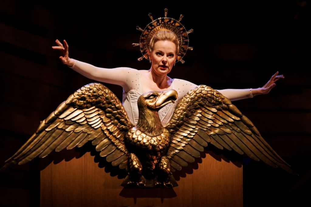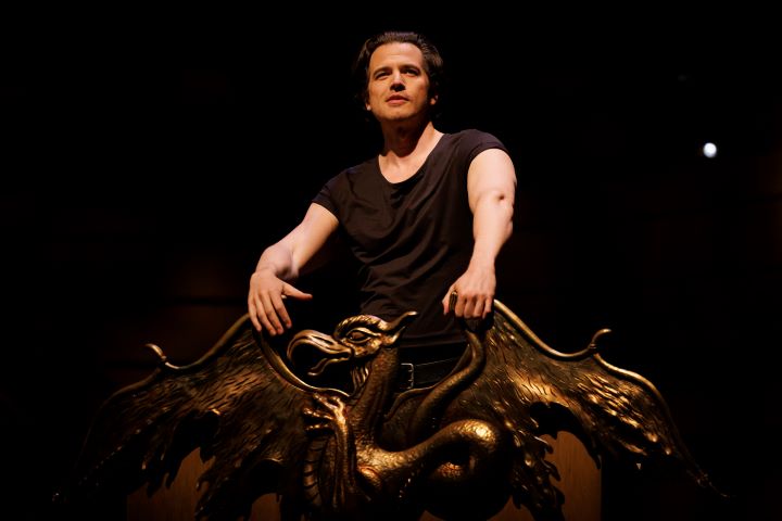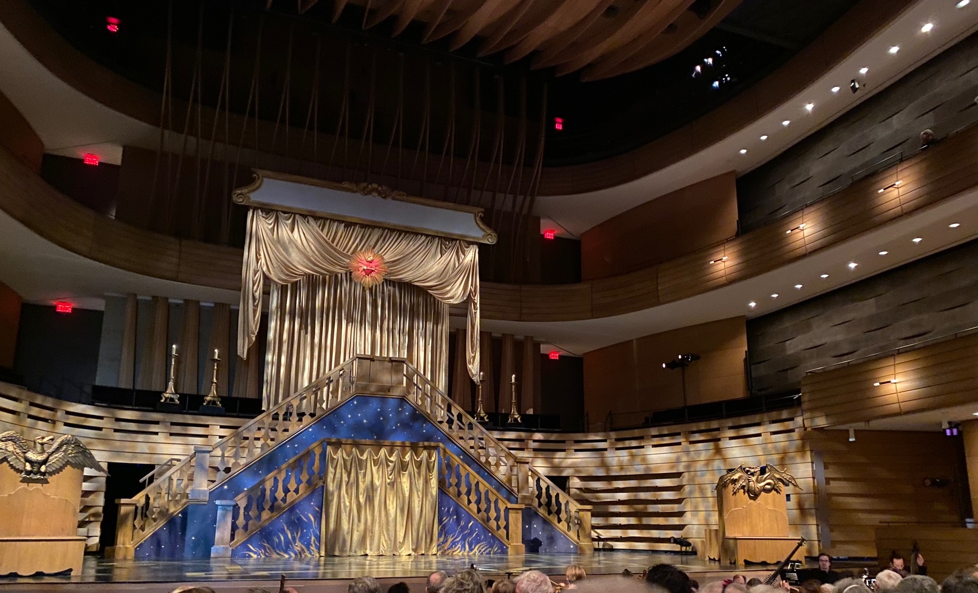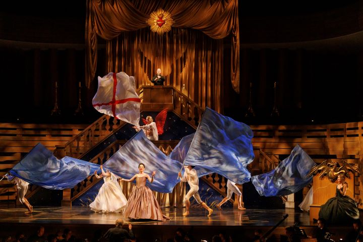 While there is much to admire in this presentation I’ll begin with the set, as it conditions our experience before the show even starts, calling attention to resident set designer Gerard Gauci’s creation. You will notice that there are matching pulpits downstage left and right.