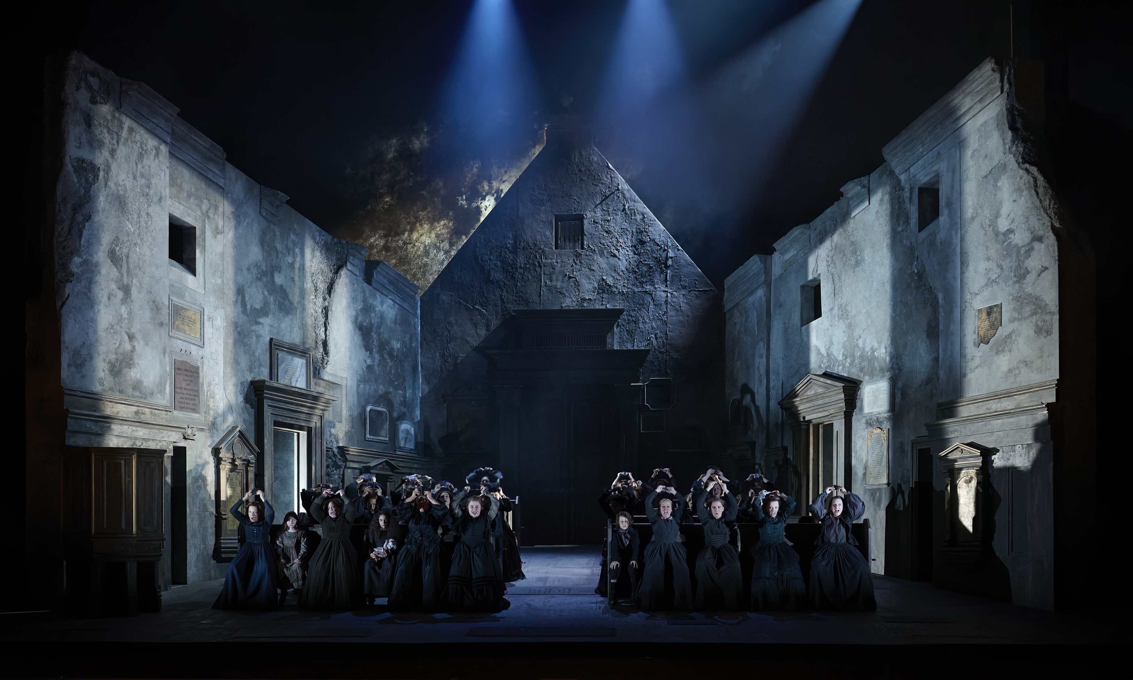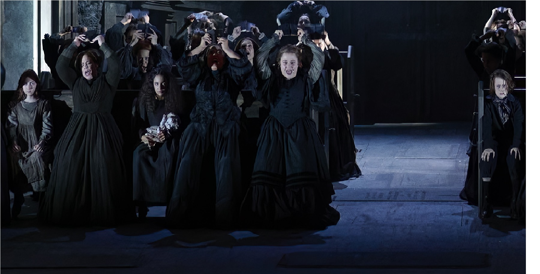 The designs from Set Designer John Macfarlane and Costume Designer Moritz Junge work with McVicar to take us deeper into a pit of gothic horror, employing additional non-singing performers. Here’s a photo plus a close-up showing something disturbing. But it’s disturbing in a good way.