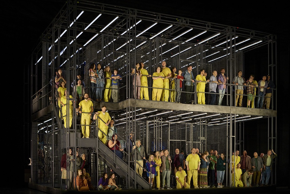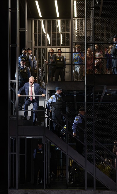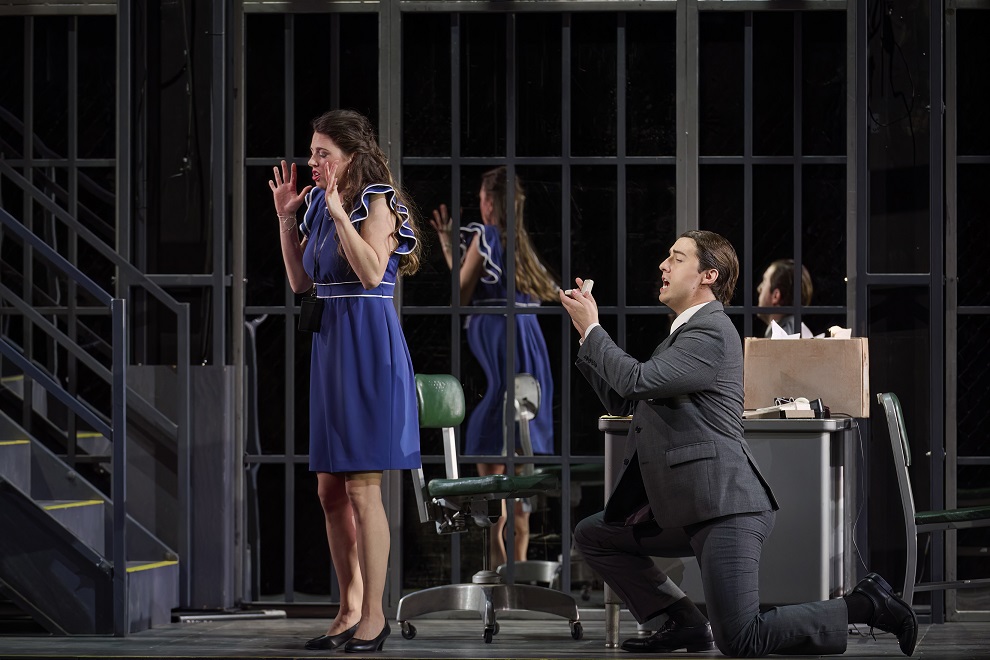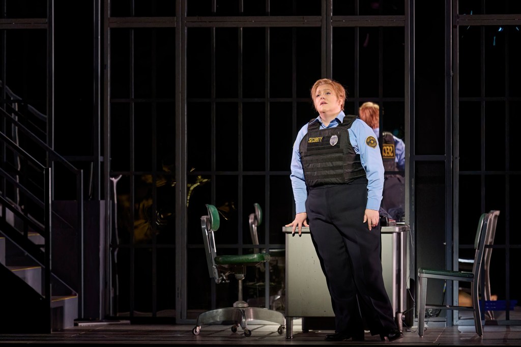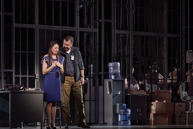 Marzelline is now fascinated by the new guard Fidelio (Miina-Liisa Värelä). In fact it seems to work better than I can ever recall, the awkward shift in tone from pastoral romance to suspenseful rescue opera much easier when played against a backdrop playing up the ironies of our modern lives. Trump might feel totally at home among all the bankers boxes strewn everywhere, although I doubt he’d ever get this close to a prison and the human casualties we see before us. The design concept might be “the banality of evil”, suggesting the ease with which one surrenders to authority, especially in an industrial prison space. Rocco (Dimitry Ivashchenko) is Marzelline’s lovable dad.