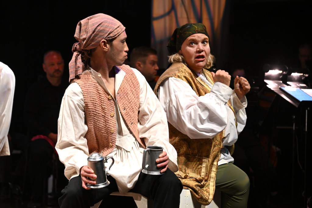 [added next morning] Oh! And I forgot to mention the changed orchestral configuration , placing them off to the side rather than in a narrow pit at the front. You can see a music stand in the picture, stage left. This improved our visual contact from the audience with the players onstage, without being blocked as in the past with that narrow orchestra pit. I’m not sure if this is the first time TOT did this, but I’d credit conductor Jennifer Tung for following from a more awkward location. As far as I can tell, this is more common in music theatre (I remember doing it in the 1970s, when it was seen as an innovation) but nowadays it’s normal. Yet perhaps it’s not common in the opera & operetta world.