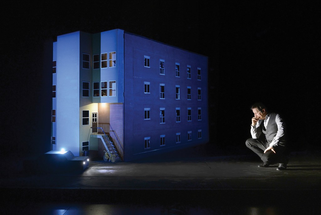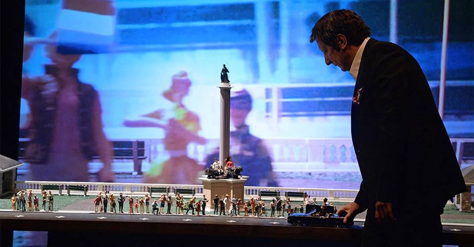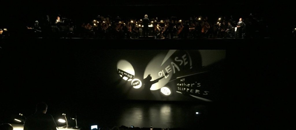 This all sounds like I like Phelim because he liked me, me me me, but that’s not my intent. Regardless of who played Leonardo – and Phelim had no control over the SATYAGRAHA casting to my knowledge – that LITTLE MATCH GIRL would have been one of the coolest productions ever, anywhere. Ten actors/puppeteers and me providing the stage visuals (and there were visuals of the huge orchestra and chorus because they surrounded the audience): Phelim and co-director Mark Down, with their hand-picked actors and me, developed a visual language using a sort of extended shadow puppetry which, like what Phelim and his troupe did with Satyagraha, perfectly complemented the music, which itself perfectly complemented the heartbreaking Hans Christian Andersen story, or at least Lachenmann’s reading of it, with a German translation of something written by Leonardo thrown into the middle, and that’s where I came in.