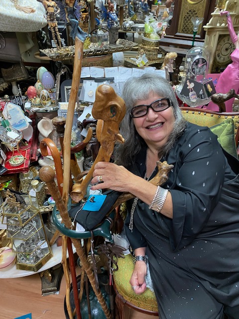 First came Angie O’H Antiques, where I tried out several walking sticks, including the shillelagh Angie herself is brandishing in the photo.