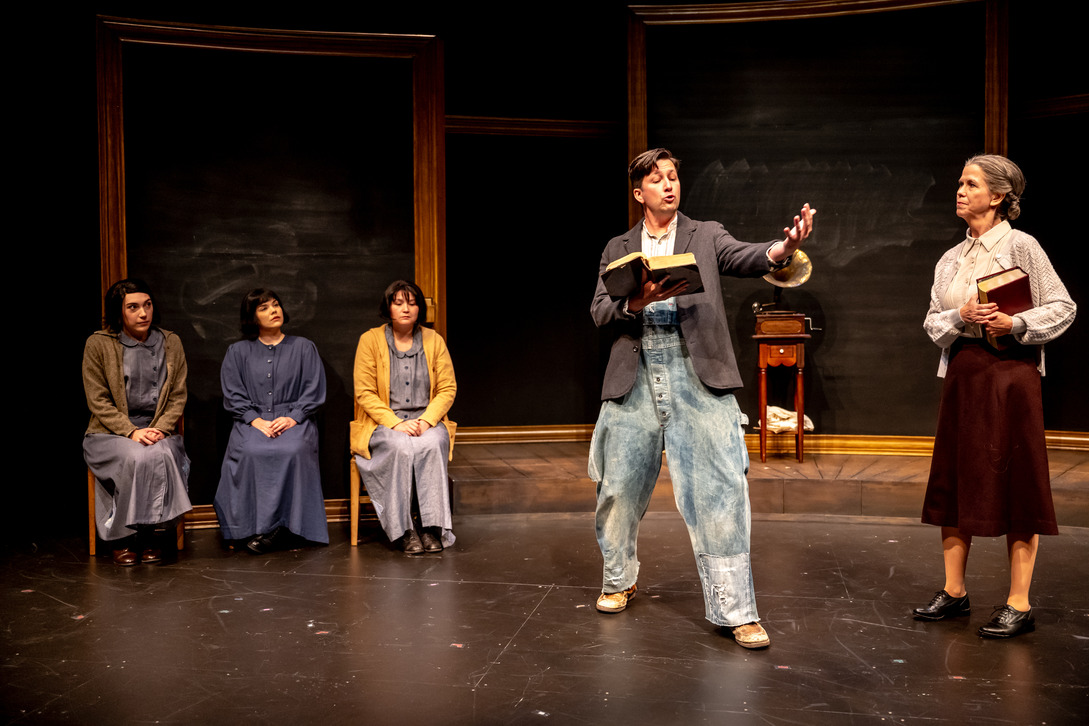 As in any first encounter with a text I’m balancing the creation of words and the performers’ creation, this time directed by Jani Lauzon, who is one of the authors. I missed seeing the piece in 2022 at Stratford, but wonder if in this incarnation it has become something new or different, deeper or perhaps lighter. I don’t know. At times we’re watching a frenetic stage full of fast moving bodies. At other times we observe a person alone in quiet reflection. At times they may struggle with language, although at times words are used playfully even if we don’t understand the words that are in an Indigenous dialect. There is so much going on, layers of meaning and action. Frequently we see words written on a blackboard, that will then be erased by Father Callum, a reminder that truthful expression is not always permitted. There is a persuasive self-assurance to this production and its cast that is irresistible, perhaps also because so many in the show are themselves Indigenous.