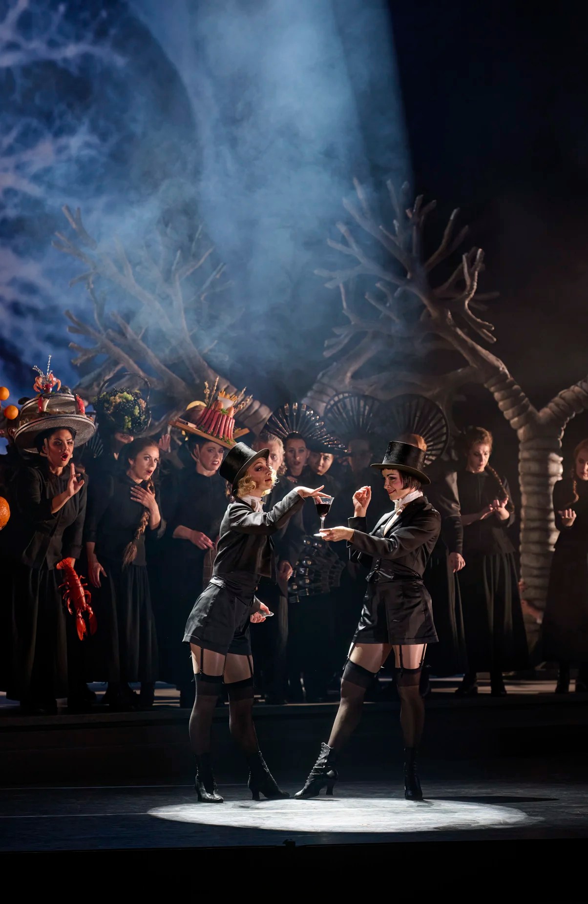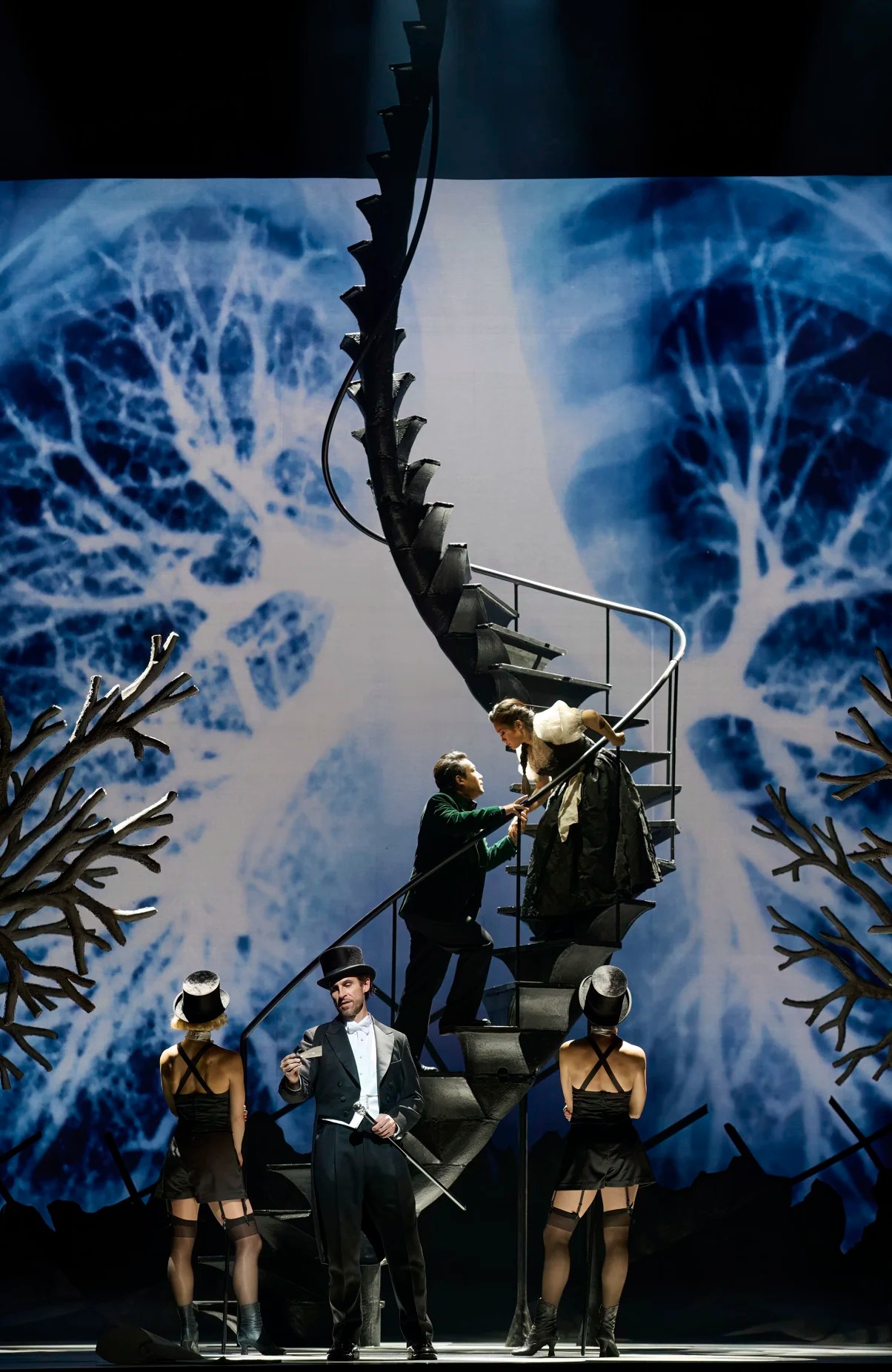 At other moments we see a huge X-ray image of lungs, echoed by the artificial trees downstage.