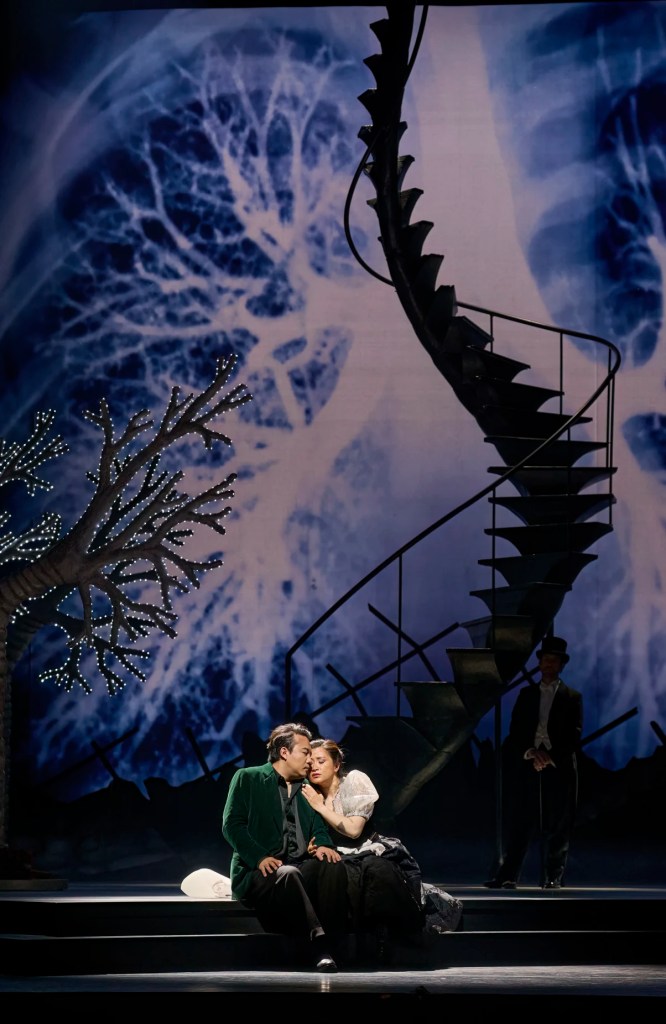 Before we even heard the first note of music, I was admiring several features of the set & costume design by Emma Ryott, as seen on the cover of the COC’s fall program. For much of the opera we’re looking at a large staircase construction resembling a human spinal column.