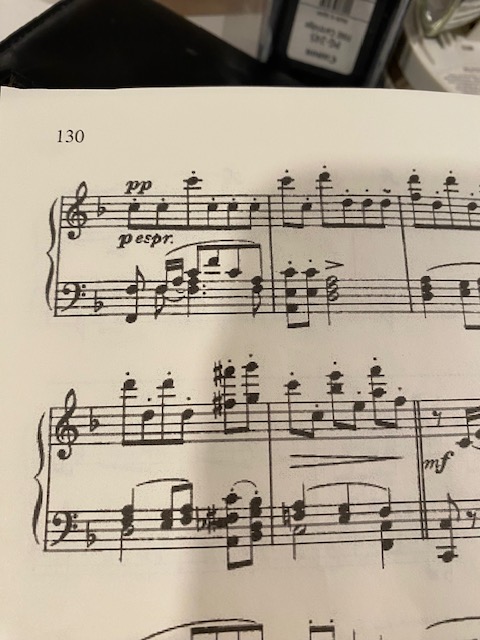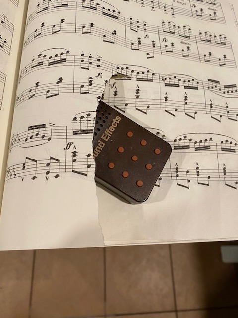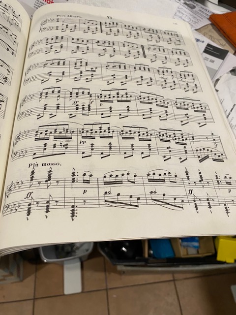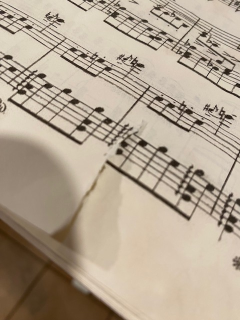 Notice that the left hand has to articulate the melody while the RH is pp, super soft and not stealing the focus. Of course that’s much easier if you’re part of a duo or in an orchestra. In the solo version it’s extra tough AND coming right after a brutally awkward page turn. How brutal? here’s a picture of the torn page, victim of my attempts to get to that soft recapitulation of the main theme.
