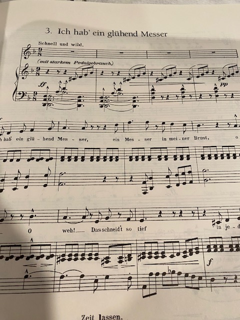 But as I look at the 3rd Song of a Wayfarer, I see something I noticed a moment ago when looking at Dvořák. Remember the “furiant”, identified as a “rapid and fiery Bohemian dance in alternating 2/4 and 3/4 time“? The first line of “ich hab’ ein gluhend Messer” also goes back and forth between duple and triple time, very much as we saw in the first and 8th slavonic dances.