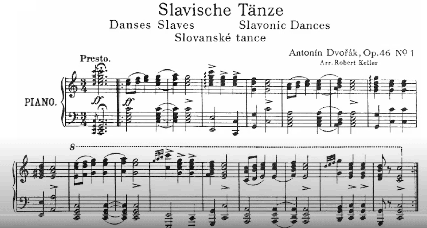 Now here’s the four-handed piano version, the original that is the first in the eight dances from Dvořák’s Op 46.