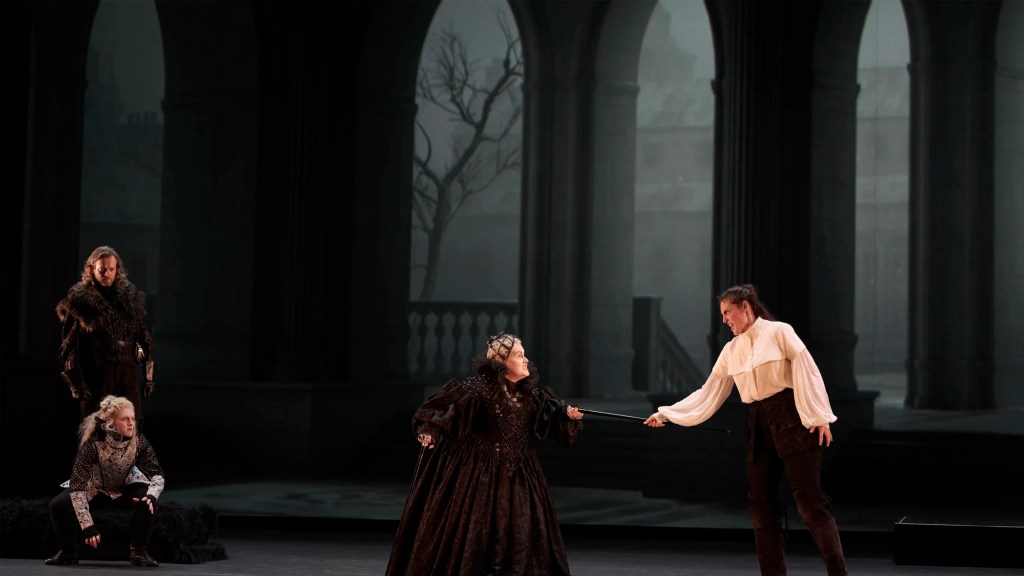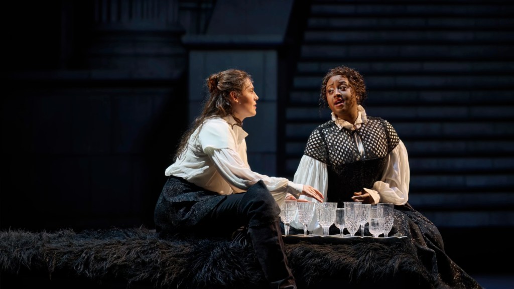 That’s especially true of the Christine and Count Karl Gustav. Each of them expresses romantic wishes. Bilodeau is tonal, melodic, but sometimes full of surprises as far as the harmonies he employs. Philippe Sly’s presence is subtle at first, emerging gradually in the second act as he has greater moments of passion. Kirsten MacKinnon as Christine is at the centre of the opera but often softly observing, not always given the opportunity to comment on the drama her life has inspired: which ends up being a good choice by Bilodeau and Bouchard, a story swirling around her until finally she begins to emerge in response to the pressures placed on her. Countess Ebba Sparre (sung by Queen Hezumuryango) also is given her clearest opportunities to show us who she is towards the end.