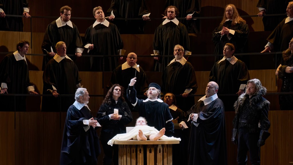 In the scene where Johan attempts seduction in the attire of a stag, prancing about the stage before being rejected by Christine, the music is very playful. We heard something similar in the piano paraphrase played at the RBA concert a couple of weeks ago, suggestions of dance rhythms. It’s absurdly excessive. Isaiah Bell played this part opening night but because he was indisposed today, we heard Wesley Harrison, currently a member of the Ensemble Studio, earning some of the biggest applause of the day.