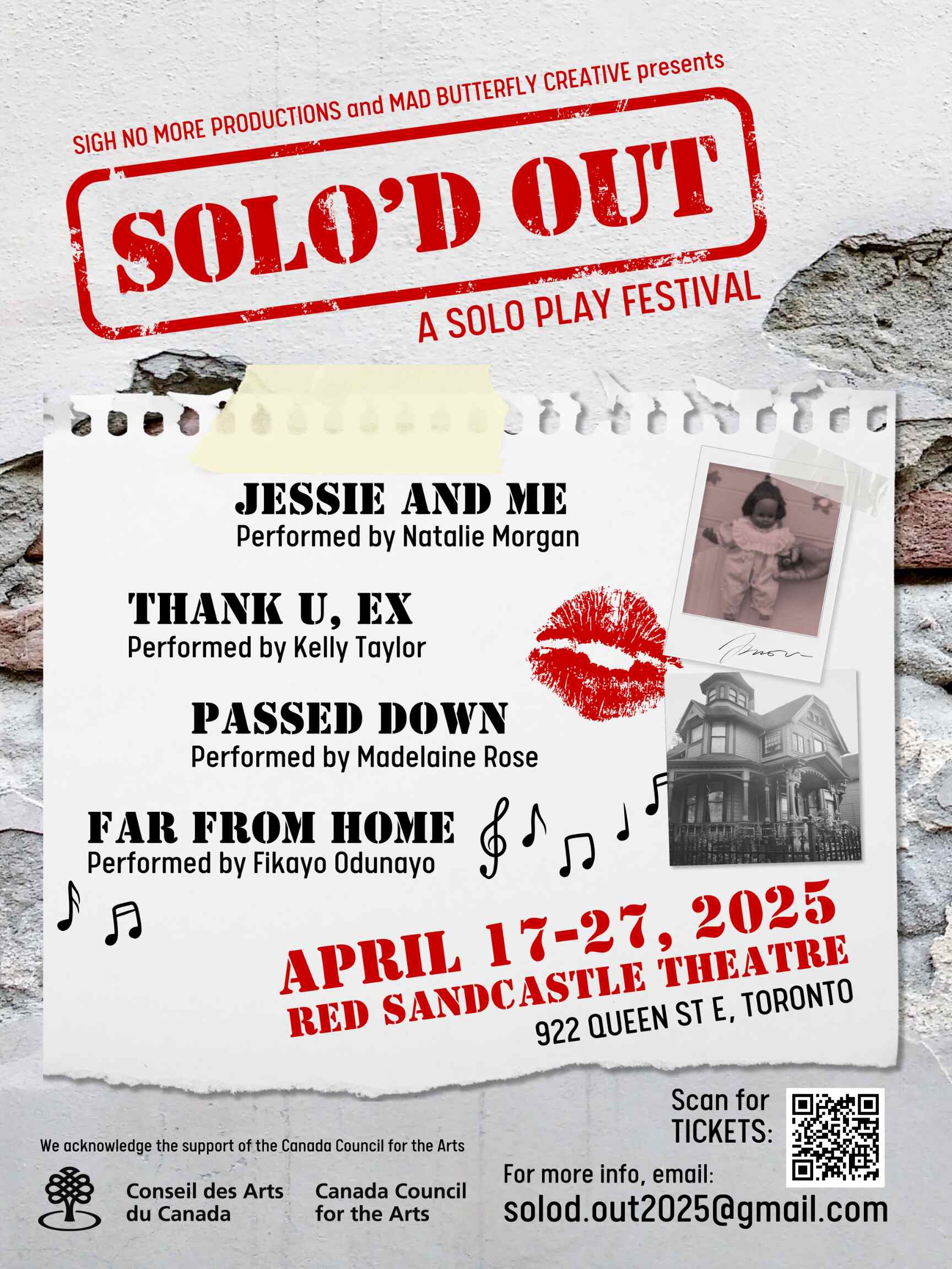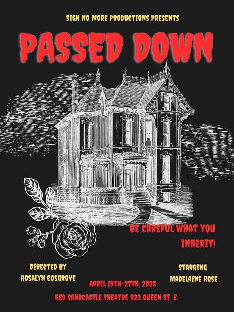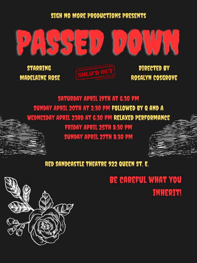 Passed Down is part of Solo’d Out, a Festival of Solo shows April 17-27 at the Red Sandcastle Theatre, 922 Queen St East. Here’s the Solo’d Out Festival website and the eventbrite link for Passed Down.