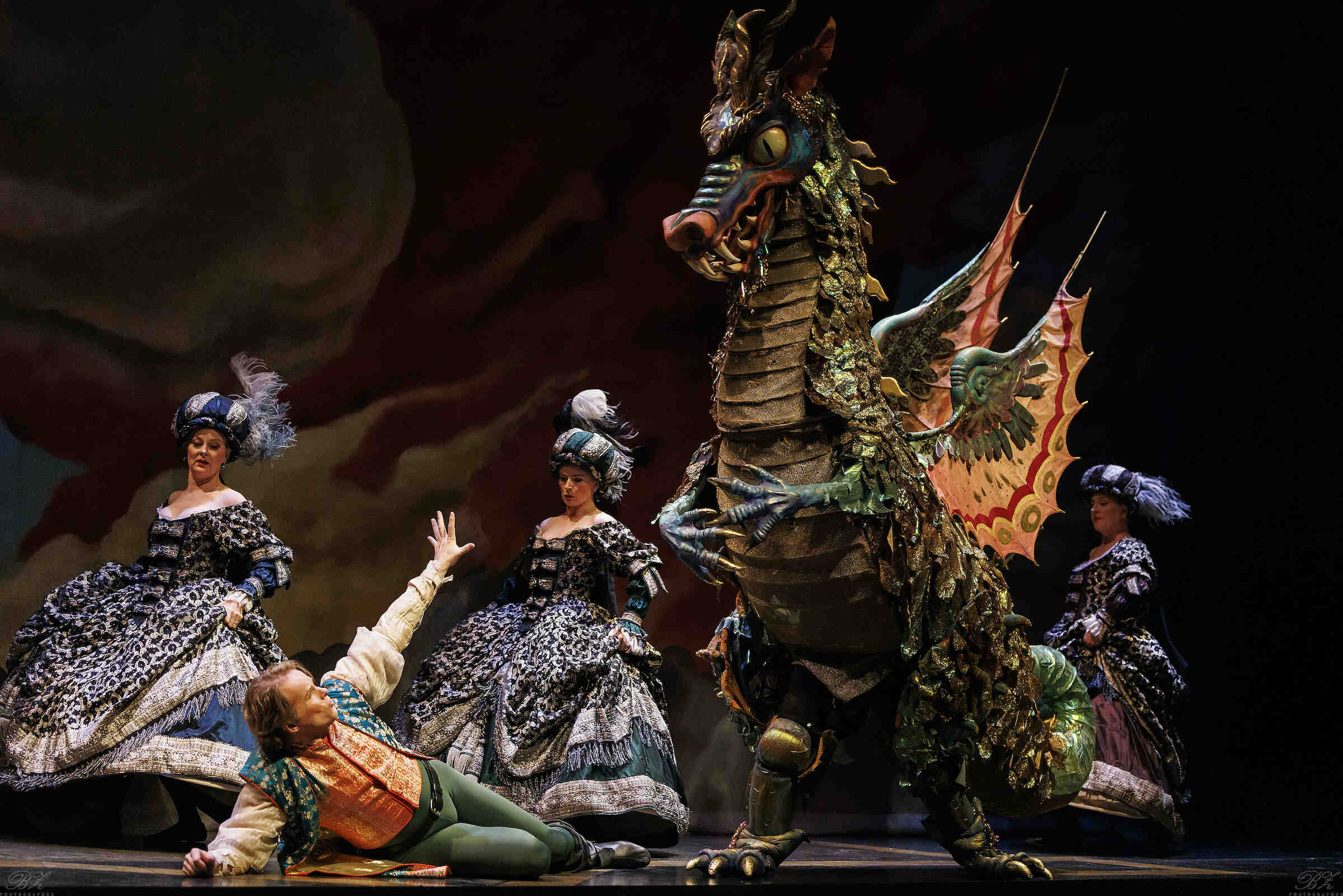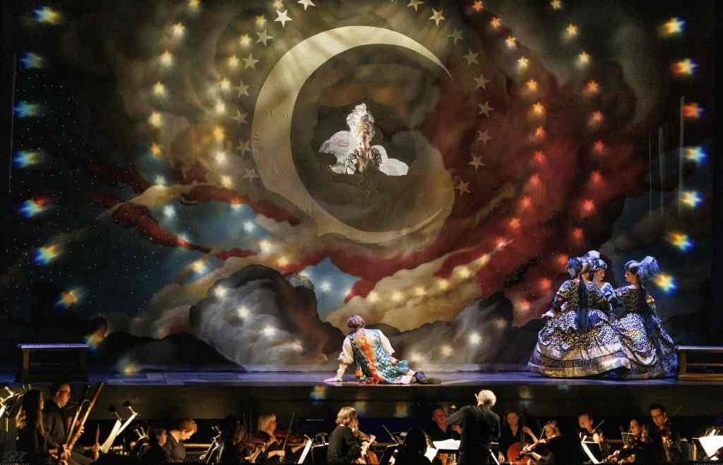 Although we sit in a theatre lit by modern lighting, Gerard Gauci’s set design encourages a period dramaturgy, employing an obviously retro stage-craft that is deliberately theatrical, where flowing fabrics simulate water & air, and where the singers never pretend that we are in a realistic space. At one point Tamino points at the dead monster speaking of its dead body lying “in the wings.” The arrival and departure of The Queen of the Night inspires awe even if the moment is completely artificial.