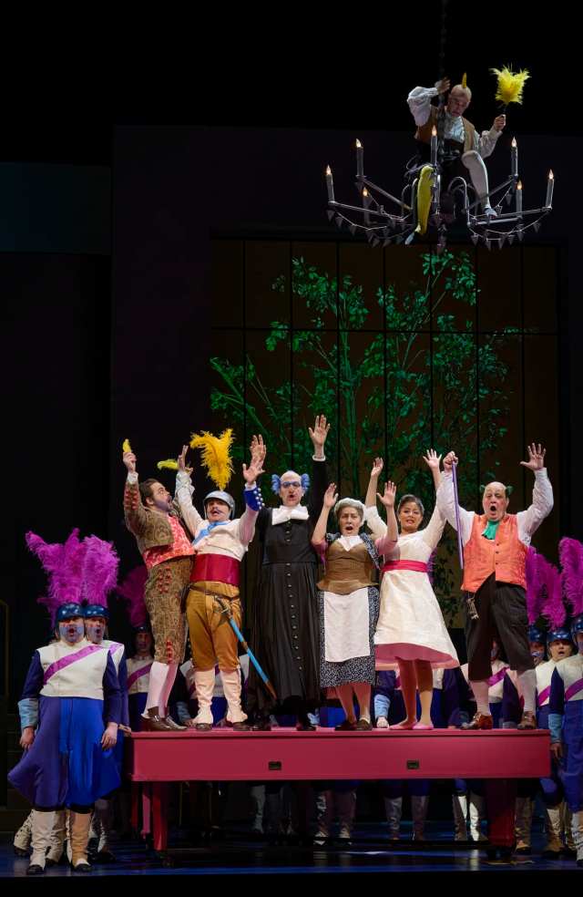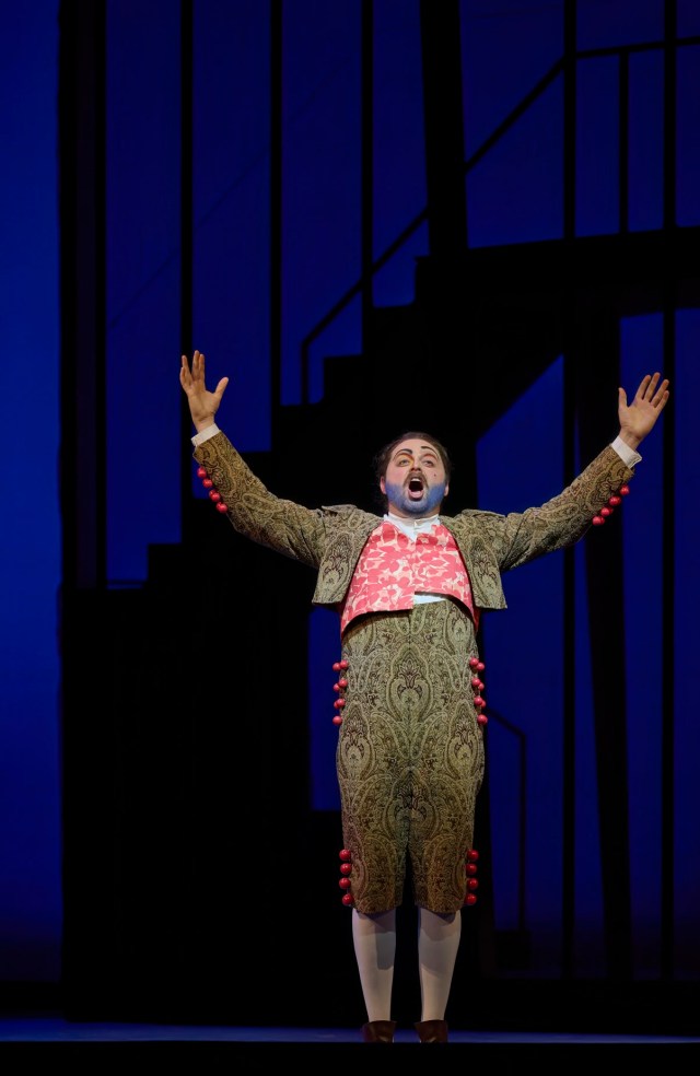 Joan Font’s direction is very vivid, putting actors on stage to unpack key moments in case you’re not able to figure things out for yourself. Don’t get me wrong, I love directors’ theatre when it illuminates, and that is certainly the case with this interpretation. For that opening aria I spoke of, Figaro’s Largo al factotum, not only does the baritone tell us of the many things he does, we get them enacted for us. Similarly when Berta sings an aria (gorgeous singing by Ariana Maubach) that in effect speaks of the opera’s core story-line, of the older man competing with the younger for a beautiful young woman, we see that acted out upstage. When Don Basilio sings of slander, we see a man effectively trapped in a kind of web, that leaves him half-naked at the end, as though he were slandered. While I may have complained previously about directors who seem unready to challenge their audience’s intelligence, I don’t want that charge directed at Font, whose imaginative theatre games invite us to engage with the illusion, thinking harder. Font gets a lot of mileage out of the flamboyant set & costume designs from Joan Guillen.