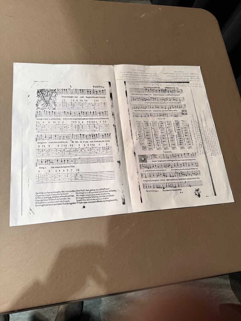 We were treated to a demonstration of a table book whereby four voices could all look on as they sang from the same page. Afterwards I asked to take a picture so that I could illustrate what they performed for us, around the table.
