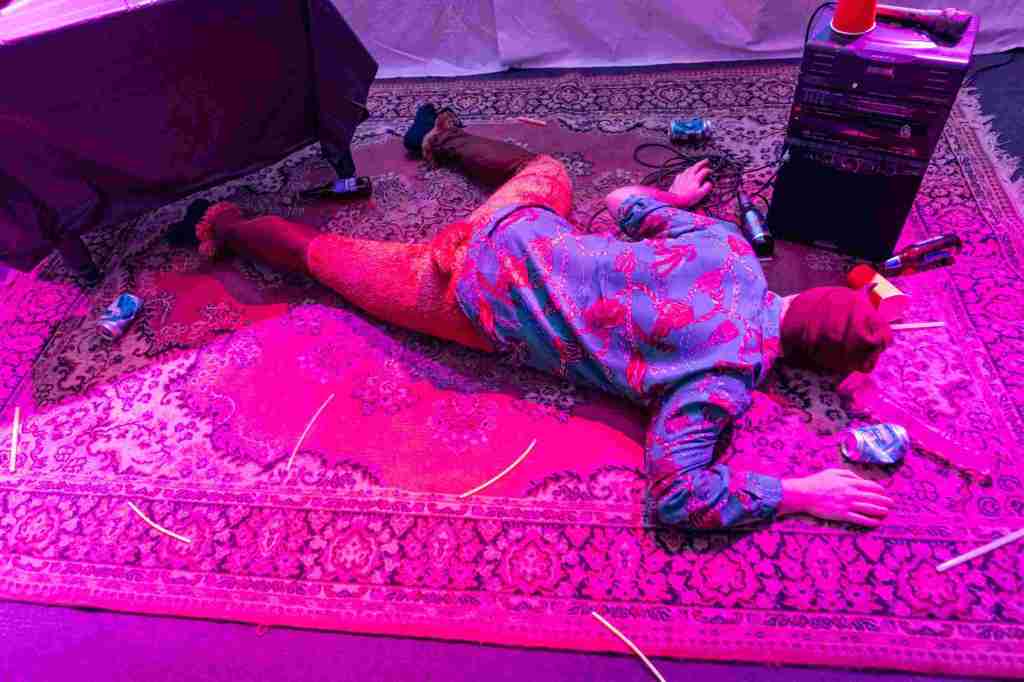 Is it serious? the core of the story is a combination of mythology, filled with all the blood & gore of a horror movie, as the Cyclops dismembers & eats Greek sailors he has captured, leading to a rescue through drunkenness and hints of lots more violence. The story-telling pops back and forth between the story and a reflective meta-space induced by drunken revelry, distanced as he tries to get his head together & his story straight. We walked into a theatre space at the corner of Bathurst & Dupont, aka the B Street Hub with our protagonist lying unconscious on the floor before us.