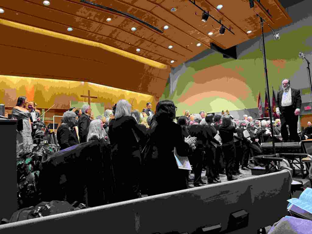 The biggest feat of all was somehow fitting the huge choir onto the front of the stage. I see on their website that they have 150 members, who stood on the floor or front steps of the stage (it’s a church space, as the cross suggests), such that we could no longer see the orchestra. Geoffrey stood on a platform to conduct the choir, orchestra & soloists, the latter trio tucked in at the side (you can see soprano Lauren Estey Jovanovic in the photo, the two men are further to our left, beyond the photo)