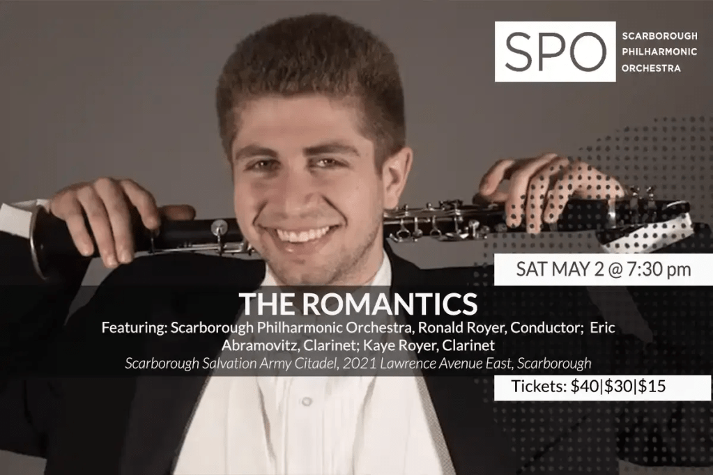 The Scarborough Philharmonic will be back at Salvation Army Scarborough Citadel on Saturday May 2nd for “The Romantics”, a program featuring two world premieres plus Weber’s clarinet concerto #1 (featuring Toronto Symphony principal clarinet Eric Abramowitz) and Beethoven’s Symphony #7.